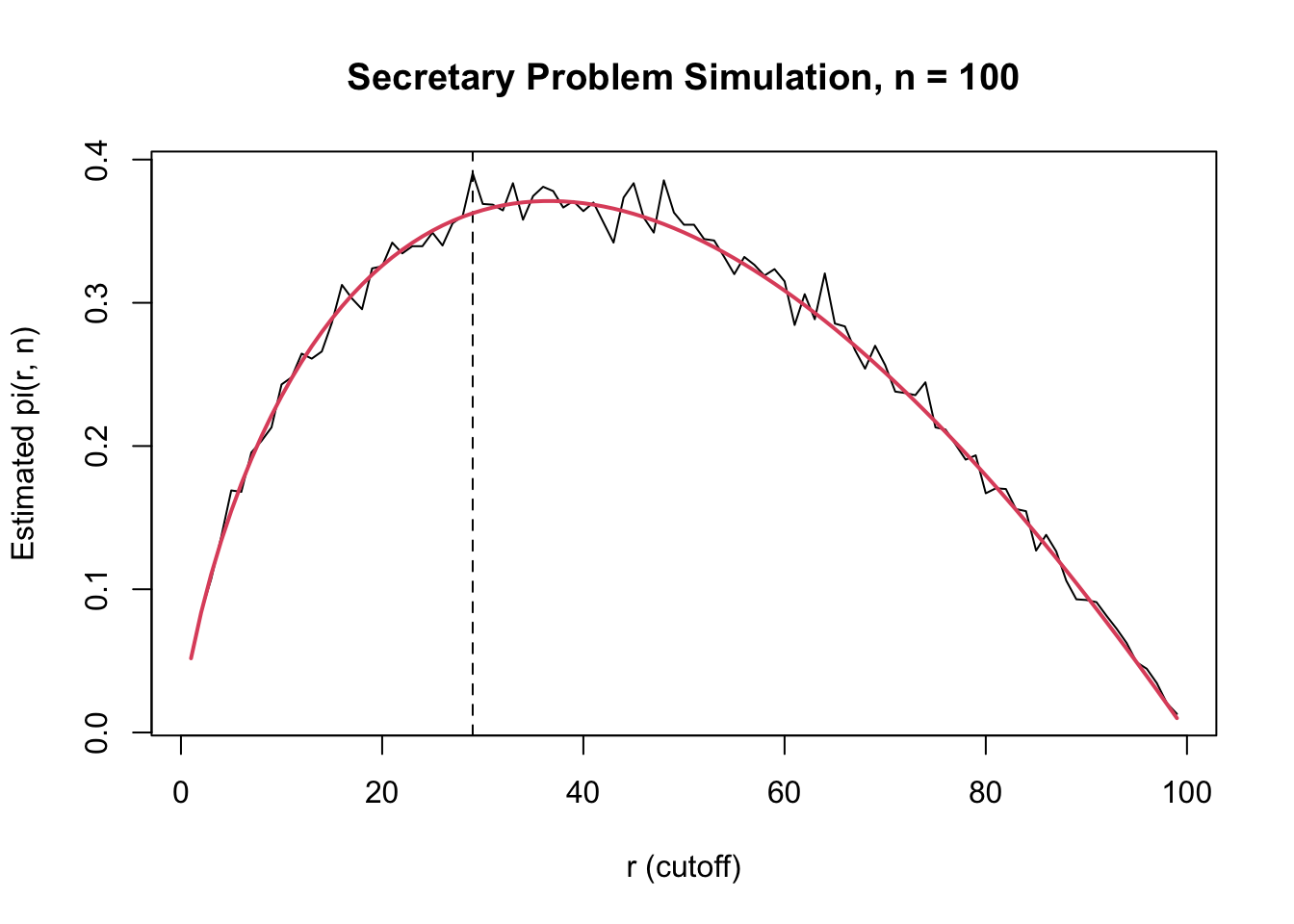 }For a fixed \(n\), we evaluate \(\pi(r,n)\) over \(r = 1, \dots, n-1\) and select the \(r\) that maximizes the probability of hiring the best applicant.