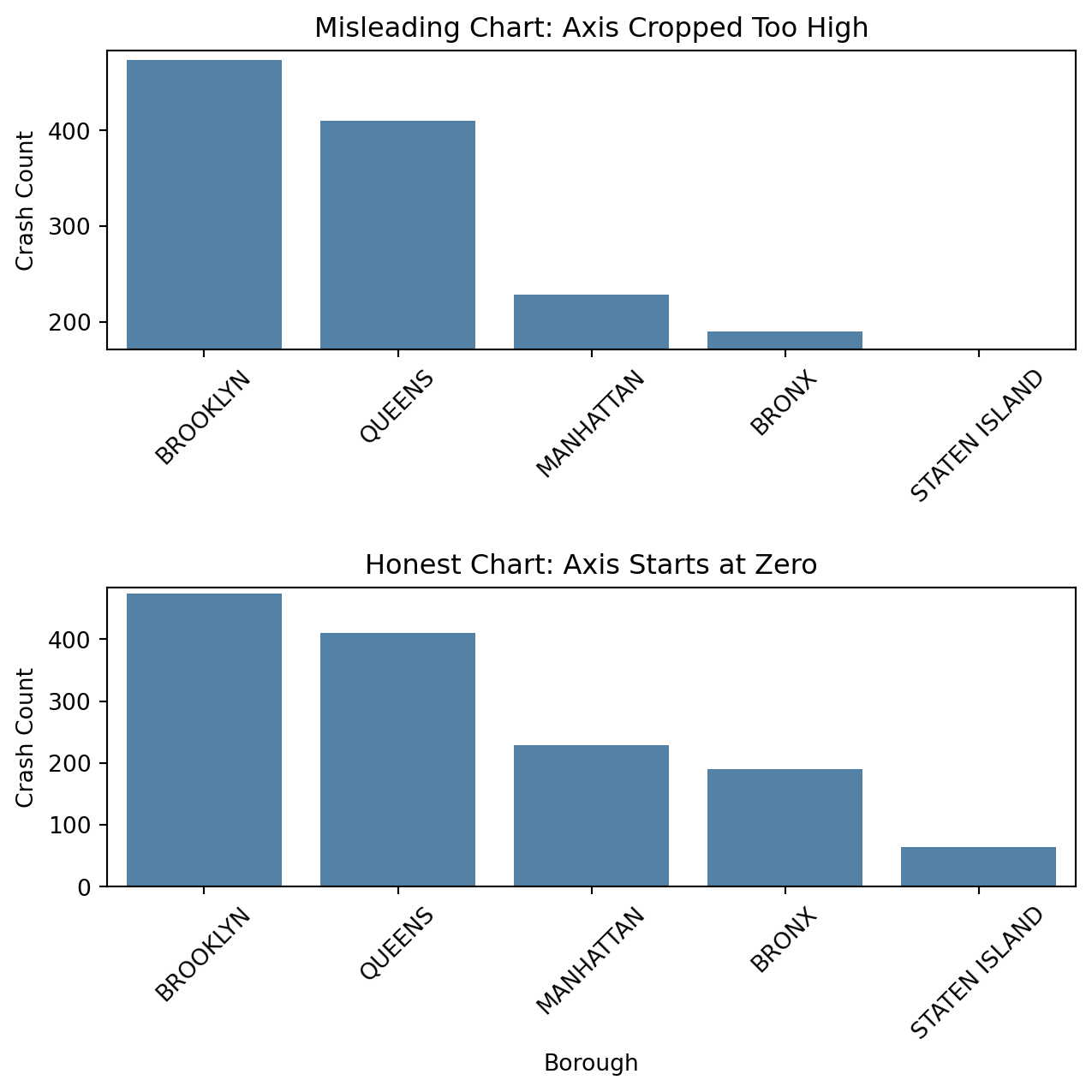 When the y-axis is cropped so it starts just below the smaller bars, Brooklyn’s crash count looks dramatically higher than the other boroughs. The honest version, which starts the y-axis at zero, shows that the differences are real but not as extreme. This demonstrates how axis limits can exaggerate scale, even when the underlying data is unchanged.