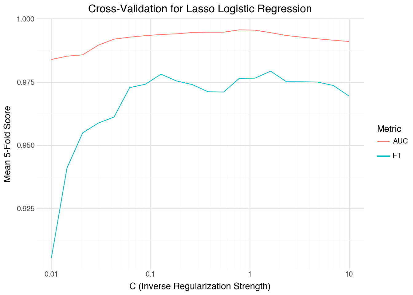 The logistic regression model with an L1 (lasso) penalty requires a tuning parameter controlling the strength of regularization. In scikit-learn, this parameter is expressed as \(C = 1 / \lambda\). Smaller \(C\) values correspond to stronger penalties, shrinking more coefficients toward zero. The goal is to select \(C\) that optimizes a performance metric such as F1 or AUC via cross-validation.