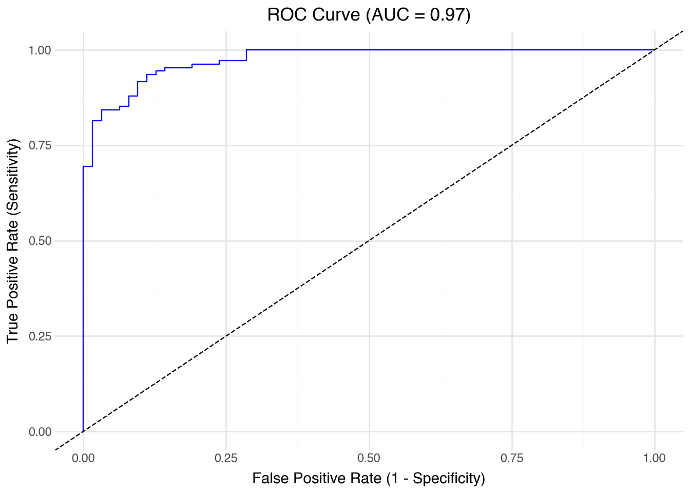from sklearn.metrics import roc_curve, roc_auc_scoreimport pandas as pdfrom plotnine import ggplot, aes, geom_line, geom_abline, labs, theme_minimal# Assume model and data are from previous logistic regression example# y_test: true labels (0/1)# y_pred_prob: predicted probabilities for the positive classy_pred_prob = model.predict_proba(X_test)[:, 1]# Compute ROC curve and AUCfpr, tpr, thresholds = roc_curve(y_test, y_pred_prob)auc_value = roc_auc_score(y_test, y_pred_prob)# Create ROC DataFrameroc_df = pd.DataFrame({'False Positive Rate': fpr,'True Positive Rate': tpr})# Plot ROC curve( ggplot(roc_df, aes(x='False Positive Rate', y='True Positive Rate')) + geom_line(color='blue') + geom_abline(linetype='dashed') + labs( title=f'ROC Curve (AUC = {auc_value:.2f})', x='False Positive Rate (1 - Specificity)', y='True Positive Rate (Sensitivity)' ) + theme_minimal())