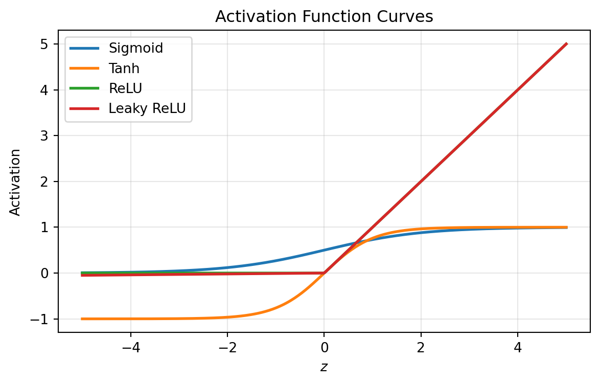 Let \(z\) denote the input to a neuron before activation. The most common choices are: