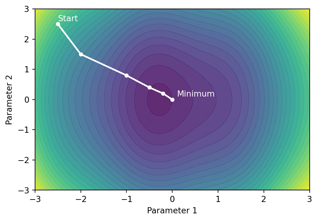 Figure 10.4 gives a two-dimensional analogy of gradient descent. In practice, a neural network may contain millions of parameters, meaning the loss function is defined over an extremely high-dimensional space. The contours shown here merely represent a projection of that space onto two dimensions for illustration.