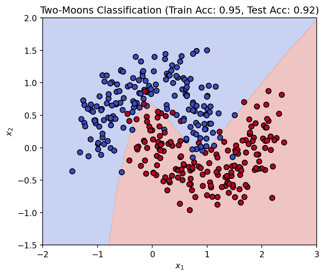 ax.set_title(f"Two-Moons Classification (Train Acc: {acc_train:.2f}, Test Acc: {acc_test:.2f})")