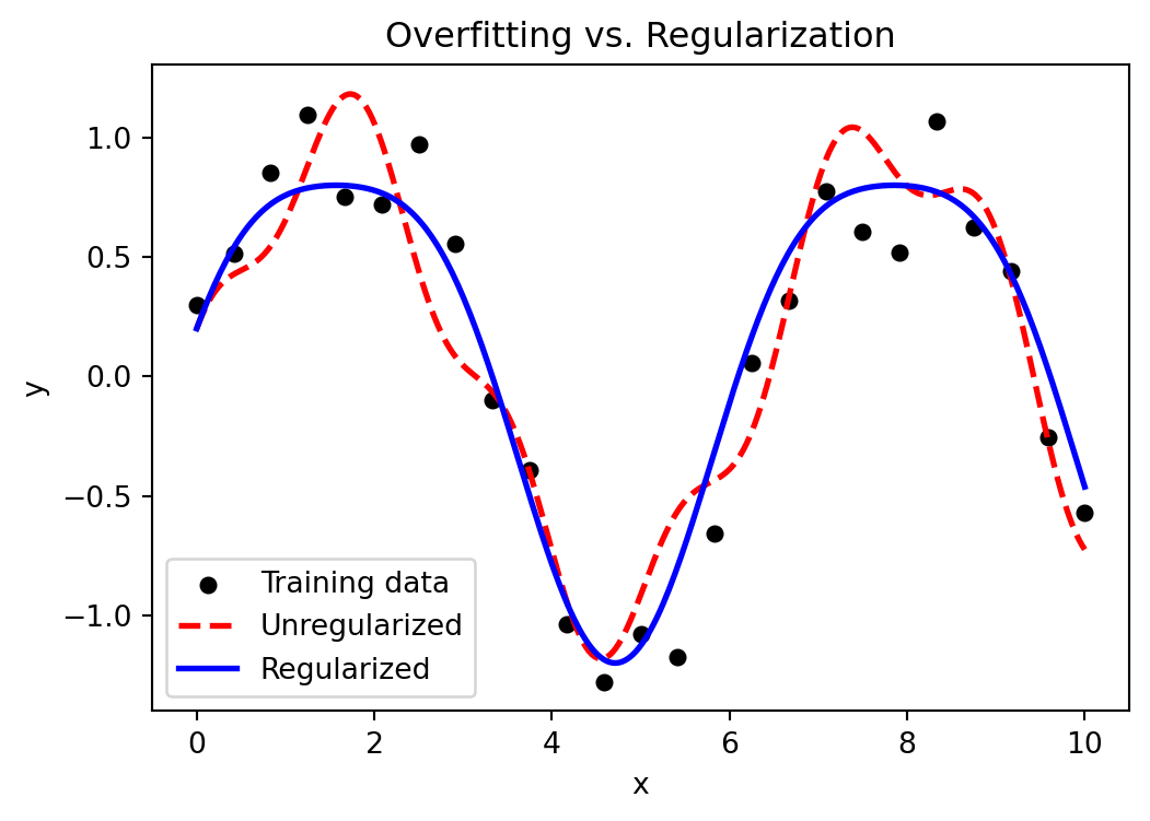 Adding model complexity (more layers or neurons) reduces bias but increases variance. The goal of regularization is to find a balance between these forces. Figure 10.5 provides a schematic view: the unregularized model follows every data fluctuation, while a regularized model captures only the underlying trend.