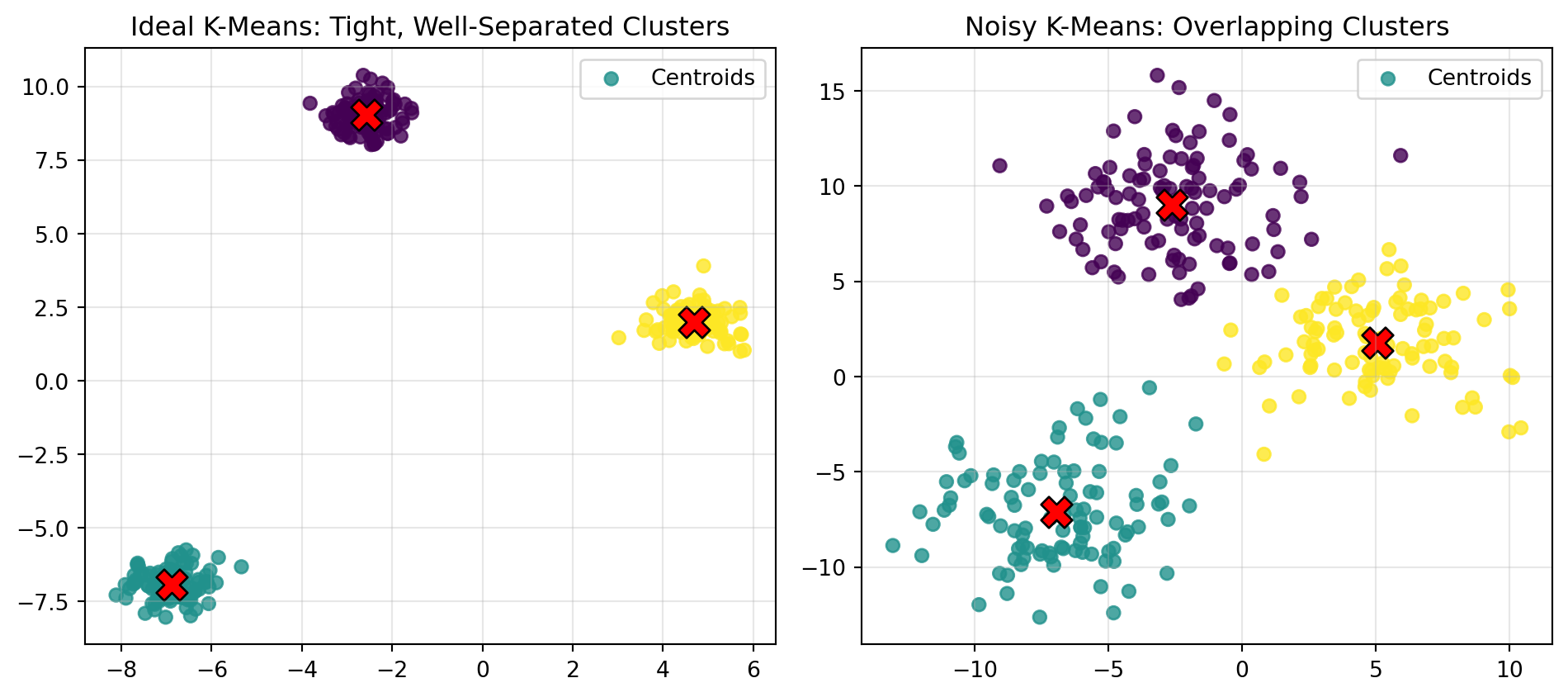 These patterns highlight both the strengths of K-Means in finding structure and the natural limits it faces when groups are not well separated.