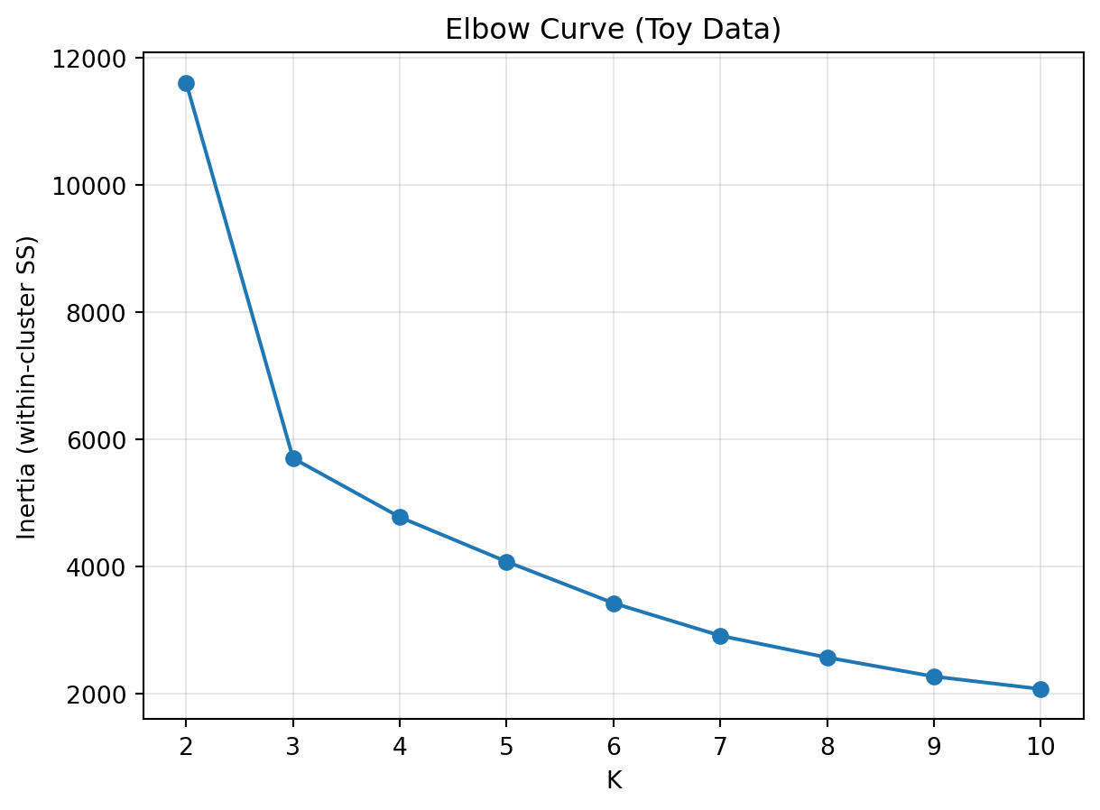from sklearn.metrics import silhouette_scorefrom sklearn.cluster import KMeansimport numpy as npsil_scores = []K_range =range(2, 11)for k in K_range: km = KMeans( n_clusters=k, n_init=10, random_state=42 ).fit(X) sil = silhouette_score(X, km.labels_) sil_scores.append(sil)best_k =list(K_range)[int(np.argmax(sil_scores))]best_k