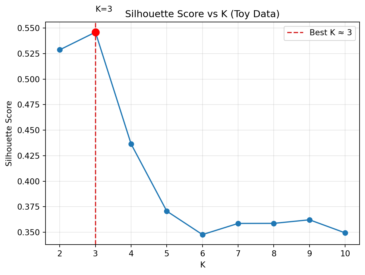 # Plot the silhouette curveplt.plot(list(K_range), sil_scores, marker="o")plt.title("Silhouette Score vs K (Toy Data)")plt.xlabel("K")plt.ylabel("Silhouette Score")# Mark the best Kplt.axvline( best_k, color="tab:red", ls="--", label=f"Best K ≈ {best_k}")plt.scatter( best_k,max(sil_scores), color="red", s=80, zorder=5)plt.text(3, sil_scores[1] +0.02,"K=3", color="black", fontsize=10)plt.legend()plt.grid(alpha=.3)plt.show()
