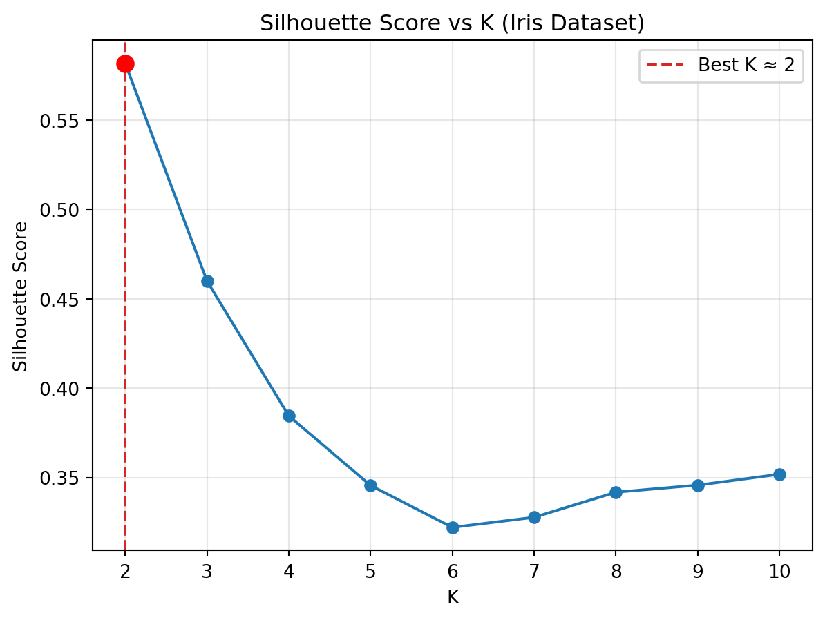 Before choosing K for the Iris dataset, we compute silhouette scores across several values of K. This gives a numerical way to compare how well different clustering solutions separate the flowers and helps identify the most meaningful number of clusters.
