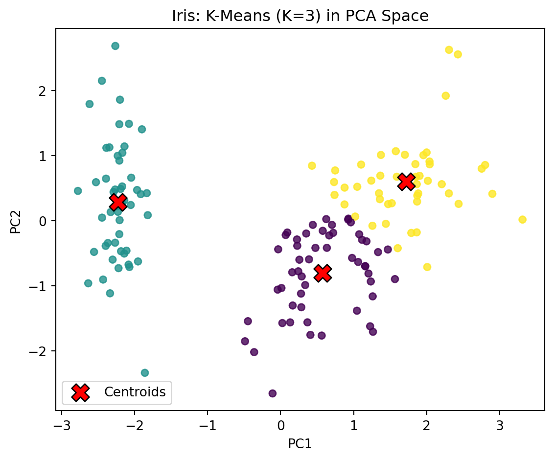 from sklearn.decomposition import PCAfrom sklearn.cluster import KMeans# 1. Fit K-Means with K=3 (typical for Iris)km_iris = KMeans( n_clusters=3, n_init=20, random_state=42).fit(X_iris_sc)labels_iris = km_iris.labels_centers_iris = km_iris.cluster_centers_# 2. Apply PCA to project 4D features into 2Dpca = PCA(n_components=2, random_state=42)X_iris_p = pca.fit_transform(X_iris_sc)centers_p = pca.transform(centers_iris)# 3. Check variance explained by first two PCspca.explained_variance_ratio_.sum()