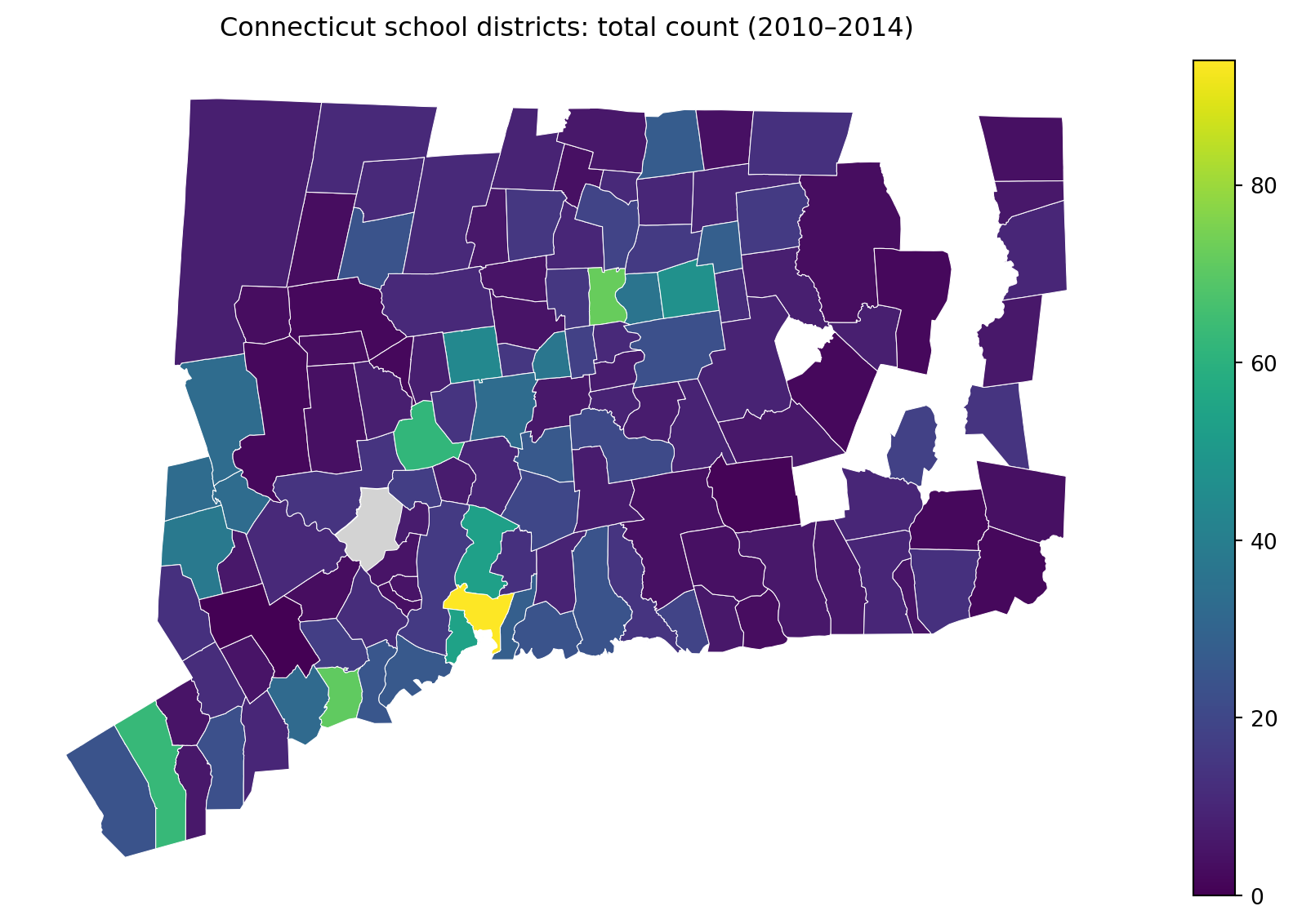 print("Missing school_district in admcount:", admcount["school_district"].isna().sum())Detected adm_cols: ['ALL2010', 'ALL2011', 'ALL2012', 'ALL2013', 'ALL2014']