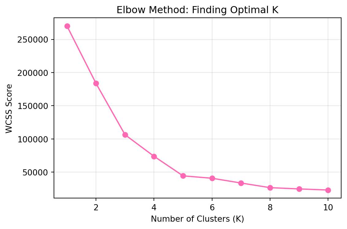 We tested K from 1 to 10 using our actual mall dataset. The “bend” happens at K=5, which is our optimal number. For our 200 shoppers, 5 clusters provide the best fit. Beyond 5, adding clusters provides very little extra value.