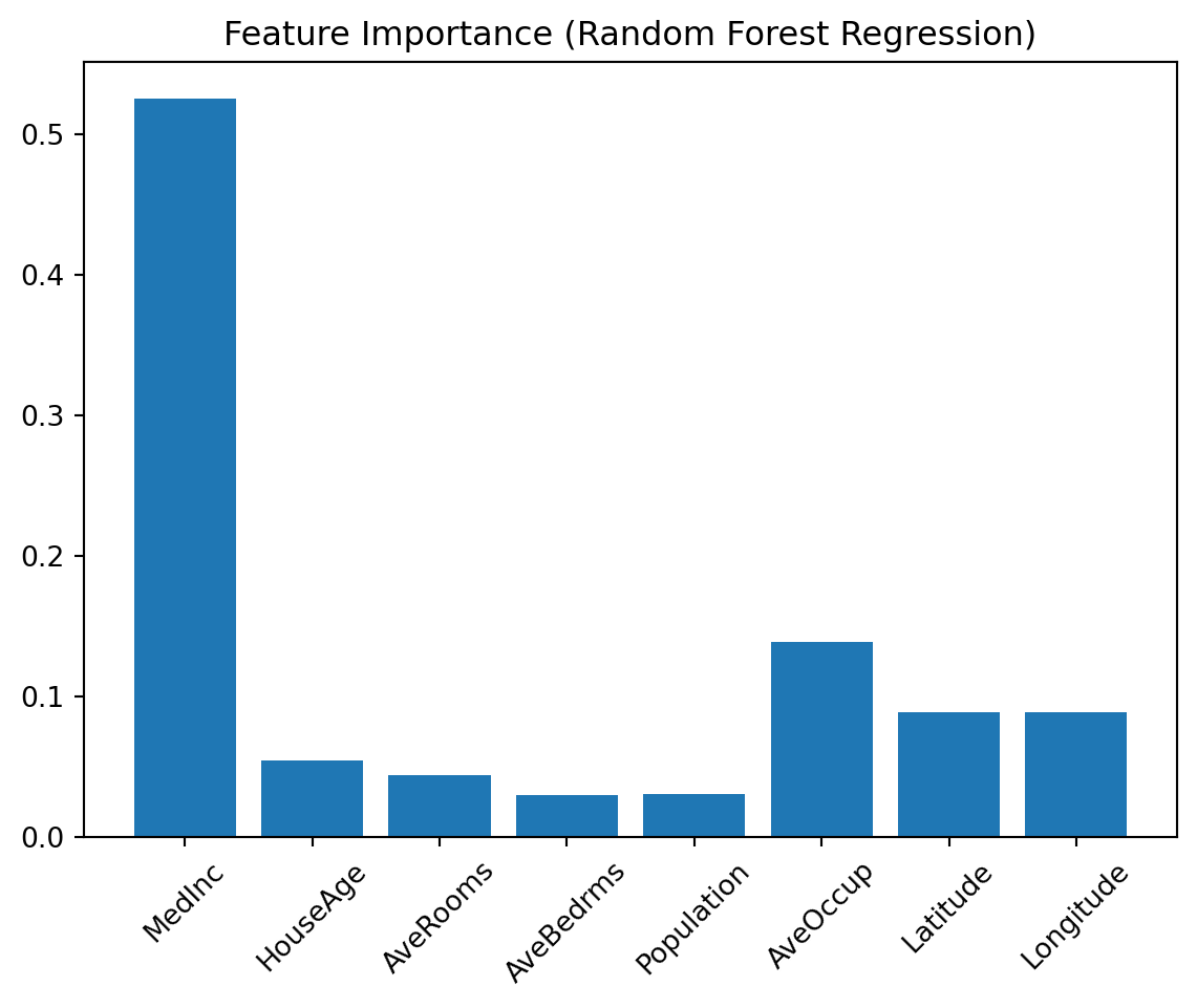 Mean squared error tells us the average squared difference between the predicted values and the actual values. In this case, an MSE of 0.25537 indicates our model is doing a pretty good job at predicting the median house values, but if we wanted to imporve our model’s accuracy we could adjust parameters such as the number of trees, the number of features considered for each split, and the depth of the trees.